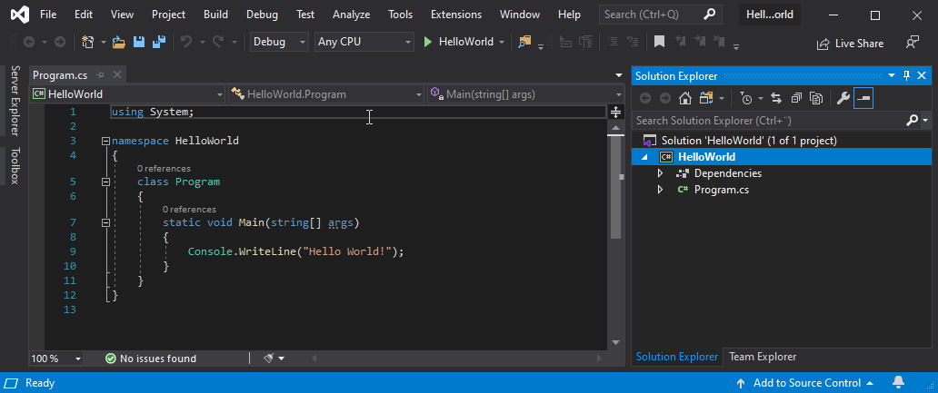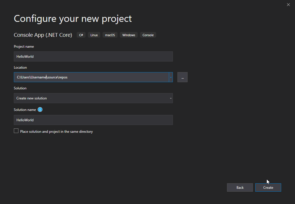 Hello World! C:\Users\Username\source\repos\HelloWorld\HelloWorld\bin\Debug\netcoreapp3.0\HelloWorld.exe (process 13784) exited with code 0. To automatically close the console when debugging stops, enable Tools->Options->Debugging->Automatically close the console when debugging stops. Press any key to close this window . . .