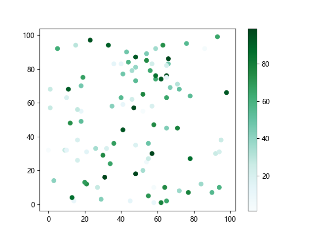 # 这三行代码使编译器能够绘图: import sys import matplotlib matplotlib.use('Agg') import matplotlib.pyplot as plt import numpy as np x = np.random.randint(100, size=(100)) y = np.random.randint(100, size=(100)) colors = np.random.randint(100, size=(100)) # 使用蓝绿色渐变绘制散点图: plt.scatter(x, y, c=colors, cmap='BuGn') plt.colorbar() # 显示颜色条 plt.show() # 显示图形 # 这两行代码使编译器能够输出图形: plt.savefig(sys.stdout.buffer) sys.stdout.flush()