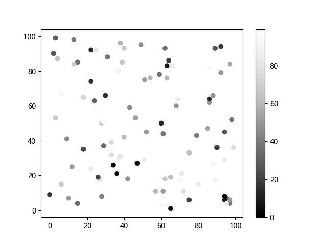 # 这三行代码使编译器能够绘图: import sys import matplotlib matplotlib.use('Agg') import matplotlib.pyplot as plt import numpy as np x = np.random.randint(100, size=(100)) y = np.random.randint(100, size=(100)) colors = np.random.randint(100, size=(100)) # 使用反向灰度渐变绘制散点图: plt.scatter(x, y, c=colors, cmap='Greys_r') plt.colorbar() plt.show() # 这两行代码使编译器能够输出图形: plt.savefig(sys.stdout.buffer) sys.stdout.flush()
