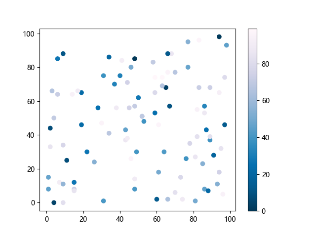 # 这三行代码使编译器能够绘图: import sys import matplotlib matplotlib.use('Agg') import matplotlib.pyplot as plt import numpy as np # 生成随机数据: x = np.random.randint(100, size=(100)) y = np.random.randint(100, size=(100)) colors = np.random.randint(100, size=(100)) # 使用 PuBu_r 配色方案绘制紫蓝色反向渐变色散点图: plt.scatter(x, y, c=colors, cmap='PuBu_r') plt.colorbar() # 显示颜色条 plt.show() # 显示图形 # 这两行代码使编译器能够输出图形: plt.savefig(sys.stdout.buffer) sys.stdout.flush()