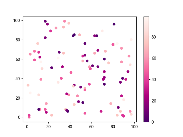 # 这三行代码使编译器能够绘图: import sys import matplotlib matplotlib.use('Agg') import matplotlib.pyplot as plt import numpy as np # 生成随机数据: x = np.random.randint(100, size=(100)) y = np.random.randint(100, size=(100)) colors = np.random.randint(100, size=(100)) # 使用 RdPu_r 配色方案绘制红紫色反向渐变色散点图: plt.scatter(x, y, c=colors, cmap='RdPu_r') plt.colorbar() # 显示颜色条 plt.show() # 显示图形 # 这两行代码使编译器能够输出图形: plt.savefig(sys.stdout.buffer) sys.stdout.flush()