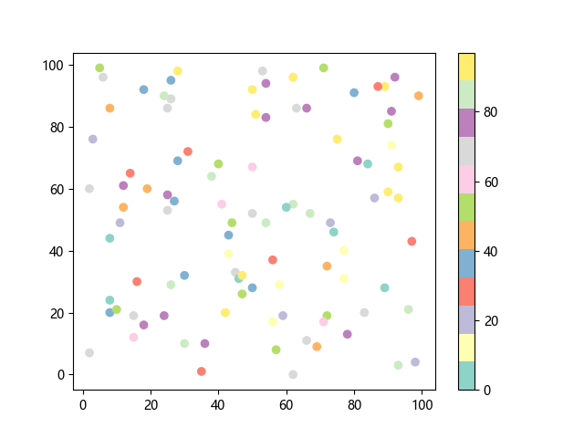 # 这三行代码使编译器能够绘图: import sys import matplotlib matplotlib.use('Agg') import matplotlib.pyplot as plt import numpy as np # 生成随机数据: x = np.random.randint(100, size=(100)) y = np.random.randint(100, size=(100)) colors = np.random.randint(100, size=(100)) # 使用 Set3 (12 色调色板)配色方案绘制 Set3 离散色散点图: plt.scatter(x, y, c=colors, cmap='Set3') plt.colorbar() # 显示颜色条 plt.show() # 显示图形 # 这两行代码使编译器能够输出图形: plt.savefig(sys.stdout.buffer) sys.stdout.flush()