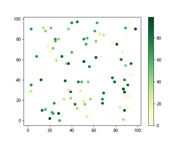 # 这三行代码使编译器能够绘图: import sys import matplotlib matplotlib.use('Agg') import matplotlib.pyplot as plt import numpy as np # 生成随机数据: x = np.random.randint(100, size=(100)) y = np.random.randint(100, size=(100)) colors = np.random.randint(100, size=(100)) # 使用 YlGn (黄-绿渐变)配色方案绘制散点图: plt.scatter(x, y, c=colors, cmap='YlGn') plt.colorbar() # 显示颜色条 plt.show() # 显示图形 # 这两行代码使编译器能够输出图形: plt.savefig(sys.stdout.buffer) sys.stdout.flush()