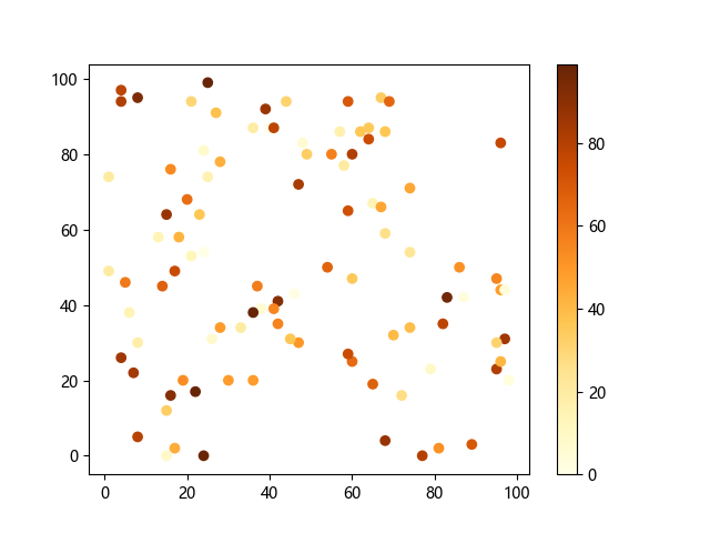 # 这三行代码使编译器能够绘图: import sys import matplotlib matplotlib.use('Agg') import matplotlib.pyplot as plt import numpy as np # 生成随机数据: x = np.random.randint(100, size=(100)) y = np.random.randint(100, size=(100)) colors = np.random.randint(100, size=(100)) # 使用 YlOrBr (黄-橙-棕渐变)配色方案绘制黄橙棕渐变散点图: plt.scatter(x, y, c=colors, cmap='YlOrBr') plt.colorbar() # 显示颜色条 plt.show() # 显示图形 # 这两行代码使编译器能够输出图形: plt.savefig(sys.stdout.buffer) sys.stdout.flush()