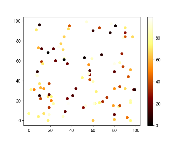 # 这三行代码使编译器能够绘图: import sys import matplotlib matplotlib.use('Agg') import matplotlib.pyplot as plt import numpy as np # 生成随机数据: x = np.random.randint(100, size=(100)) y = np.random.randint(100, size=(100)) colors = np.random.randint(100, size=(100)) # 使用 afmhot (热金属)配色方案绘制热金属色散点图: plt.scatter(x, y, c=colors, cmap='afmhot') plt.colorbar() # 显示颜色条 plt.show() # 显示图形 # 这两行代码使编译器能够输出图形: plt.savefig(sys.stdout.buffer) sys.stdout.flush()