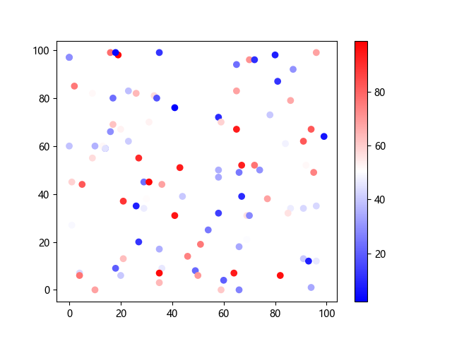 # 这三行代码使编译器能够绘图: import sys import matplotlib matplotlib.use('Agg') import matplotlib.pyplot as plt import numpy as np # 生成随机数据 x = np.random.randint(100, size=(100)) y = np.random.randint(100, size=(100)) colors = np.random.randint(100, size=(100)) # 使用 bwr 配色方案绘制蓝白红渐变色散点图: plt.scatter(x, y, c=colors, cmap='bwr') plt.colorbar() plt.show() # 这两行代码使编译器能够输出图形: plt.savefig(sys.stdout.buffer) sys.stdout.flush()
