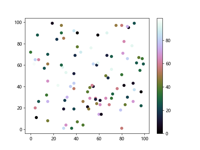 # 这三行代码使编译器能够绘图: import sys import matplotlib matplotlib.use('Agg') import matplotlib.pyplot as plt import numpy as np # 生成随机数据 x = np.random.randint(100, size=(100)) y = np.random.randint(100, size=(100)) colors = np.random.randint(100, size=(100)) # 使用 cubehelix 配色方案绘制螺旋立方体渐变色散点图: plt.scatter(x, y, c=colors, cmap='cubehelix') plt.colorbar() plt.show() # 这两行代码使编译器能够输出图形: plt.savefig(sys.stdout.buffer) sys.stdout.flush()