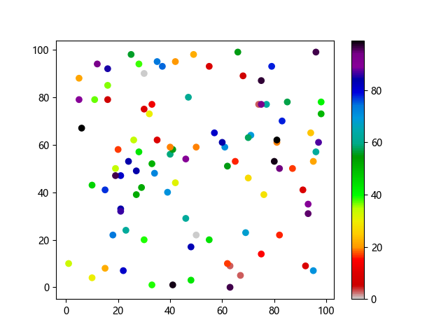 #Three lines to make our compiler able to draw: import sys import matplotlib matplotlib.use('Agg') import matplotlib.pyplot as plt import numpy as np x = np.random.randint(100, size=(100)) y = np.random.randint(100, size=(100)) colors = np.random.randint(100, size=(100)) plt.scatter(x, y, c=colors, cmap='nipy_spectral_r') plt.colorbar() plt.show() #Two lines to make our compiler able to draw: plt.savefig(sys.stdout.buffer) sys.stdout.flush()