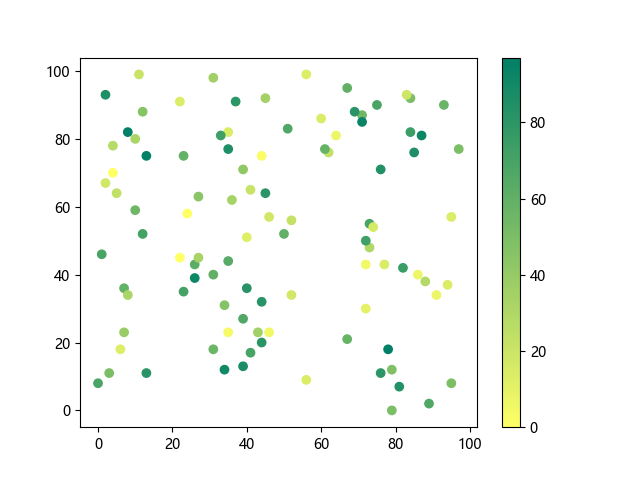 # 以下三行代码使编译器支持绘图功能: import sys import matplotlib matplotlib.use('Agg') import matplotlib.pyplot as plt import numpy as np # 生成随机数据: x = np.random.randint(100, size=(100)) y = np.random.randint(100, size=(100)) colors = np.random.randint(100, size=(100)) # 使用 summer 反向配色方案创建散点图: plt.scatter(x, y, c=colors, cmap='summer_r') plt.colorbar() plt.show() # 以下两行代码使编译器能够输出图形: plt.savefig(sys.stdout.buffer) sys.stdout.flush()