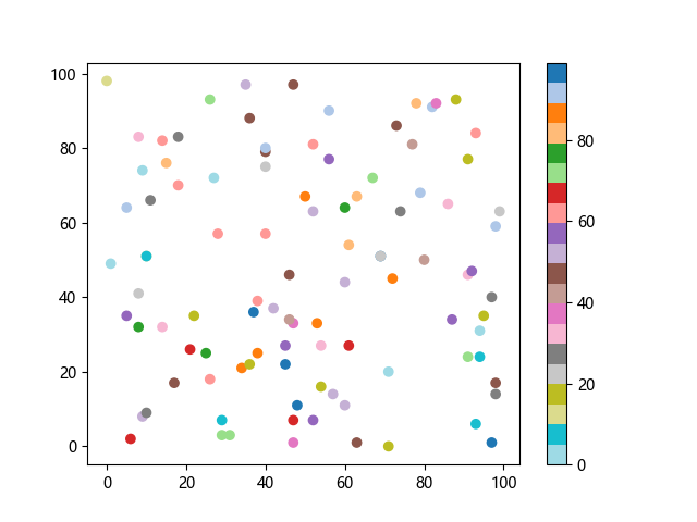 # 以下三行代码使编译器支持绘图功能: import sys import matplotlib matplotlib.use('Agg') import matplotlib.pyplot as plt import numpy as np # 生成随机数据: x = np.random.randint(100, size=(100)) y = np.random.randint(100, size=(100)) colors = np.random.randint(100, size=(100)) # 使用 tab20 反向离散配色方案创建散点图: plt.scatter(x, y, c=colors, cmap='tab20_r') plt.colorbar() plt.show() # 以下两行代码使编译器能够输出图形: plt.savefig(sys.stdout.buffer) sys.stdout.flush()