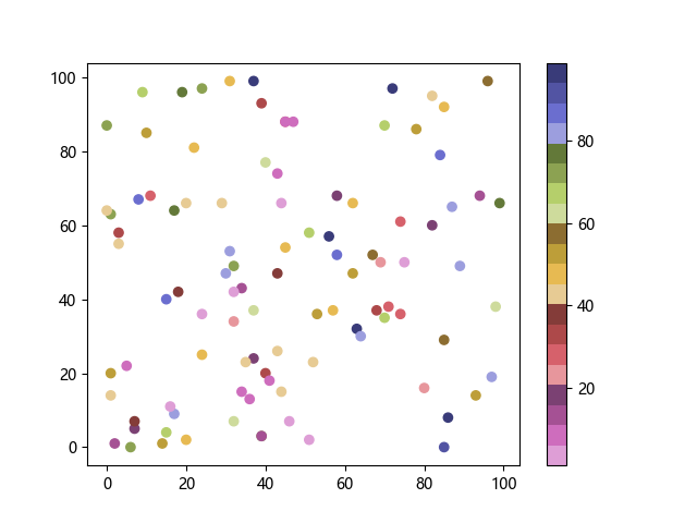 # 以下三行代码使编译器支持绘图功能: import sys import matplotlib matplotlib.use('Agg') import matplotlib.pyplot as plt import numpy as np # 生成随机数据: x = np.random.randint(100, size=(100)) y = np.random.randint(100, size=(100)) colors = np.random.randint(100, size=(100)) # 使用 tab20b 反向离散配色方案创建散点图: plt.scatter(x, y, c=colors, cmap='tab20b_r') plt.colorbar() plt.show() # 以下两行代码使编译器能够输出图形: plt.savefig(sys.stdout.buffer) sys.stdout.flush()