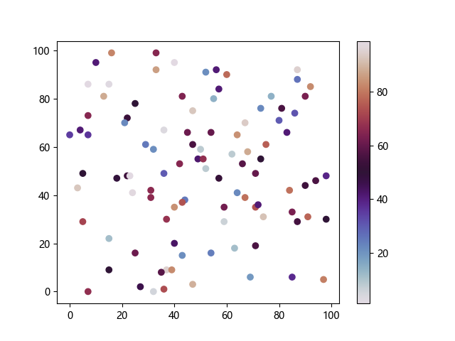# 以下三行代码使编译器支持绘图功能: import sys import matplotlib matplotlib.use('Agg') import matplotlib.pyplot as plt import numpy as np # 生成随机数据: x = np.random.randint(100, size=(100)) y = np.random.randint(100, size=(100)) colors = np.random.randint(100, size=(100)) # 使用 twilight 配色方案创建散点图: plt.scatter(x, y, c=colors, cmap='twilight') plt.colorbar() plt.show() # 以下两行代码使编译器能够输出图形: plt.savefig(sys.stdout.buffer) sys.stdout.flush()