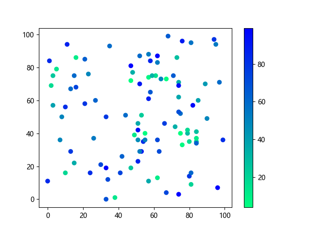 # 以下三行代码使编译器支持绘图功能: import sys import matplotlib matplotlib.use('Agg') import matplotlib.pyplot as plt import numpy as np # 生成随机数据: x = np.random.randint(100, size=(100)) y = np.random.randint(100, size=(100)) colors = np.random.randint(100, size=(100)) # 使用冬季反向 (winter_r) 配色方案创建散点图: plt.scatter(x, y, c=colors, cmap='winter_r') plt.colorbar() plt.show() # 以下两行代码使编译器能够输出图形: plt.savefig(sys.stdout.buffer) # 将图形保存到标准输出缓冲区 sys.stdout.flush() # 刷新输出缓冲区