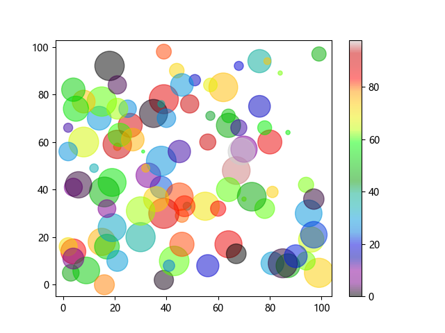 # 以下三行代码使编译器支持绘图功能: import sys import matplotlib matplotlib.use('Agg') import matplotlib.pyplot as plt import numpy as np # 生成随机数据: x = np.random.randint(100, size=(100)) y = np.random.randint(100, size=(100)) colors = np.random.randint(100, size=(100)) sizes = 10 * np.random.randint(100, size=(100)) # 点大小(10-990随机值) # 使用光谱配色、半透明效果创建散点图: plt.scatter(x, y, c=colors, s=sizes, alpha=0.5, cmap='nipy_spectral') plt.colorbar() plt.show() # 以下两行代码使编译器能够输出图形: plt.savefig(sys.stdout.buffer) sys.stdout.flush()