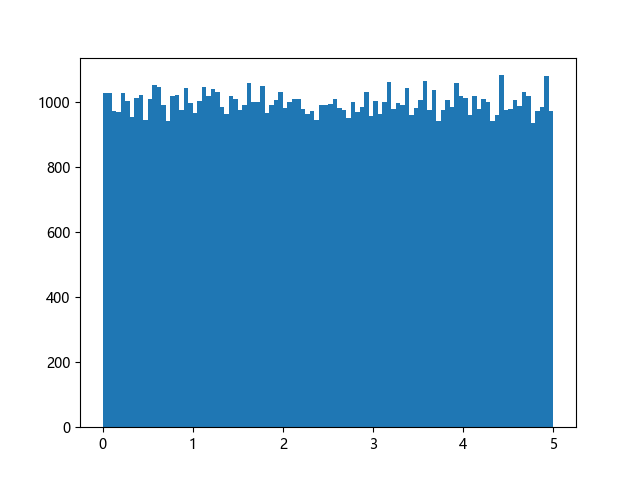# 使编译器支持绘图的三行配置: import sys import matplotlib matplotlib.use('Agg') import numpy import matplotlib.pyplot as plt x = numpy.random.uniform(0.0, 5.0, 100000) plt.hist(x, 100) plt.show() # 实现编译器绘图功能的两行代码: plt.savefig(sys.stdout.buffer) sys.stdout.flush()