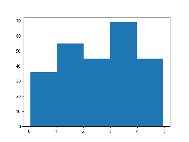 # 使我们的编译器能够绘制的三行代码: import sys import matplotlib matplotlib.use('Agg') import numpy import matplotlib.pyplot as plt x = numpy.random.uniform(0.0, 5.0, 250) plt.hist(x, 5) plt.show() # 使我们的编译器能够绘制的两行代码: plt.savefig(sys.stdout.buffer) sys.stdout.flush()