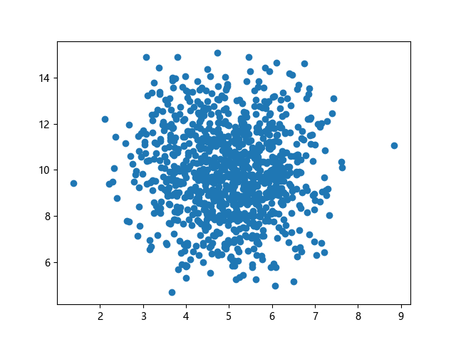 # 三行配置使编译器支持绘图功能: import sys import matplotlib matplotlib.use('Agg') import numpy import matplotlib.pyplot as plt # 生成正态分布数据:x~N(5.0,1.0),y~N(10.0,2.0),各 1000 个样本点: x = numpy.random.normal(5.0, 1.0, 1000) y = numpy.random.normal(10.0, 2.0, 1000) # 绘制散点图 plt.scatter(x, y) plt.show() # 两行代码实现图形输出: plt.savefig(sys.stdout.buffer) sys.stdout.flush()